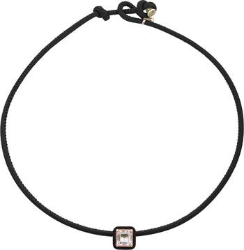 A sparkling square crystal pendant brings eye-catching shine to a slender leather choker necklace.