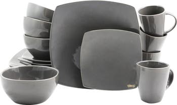 This androgynous dinnerware set by Gibson Home is a great fit for any home. Whether to dress a bachelor's table or for family homes, the sleek and elegant gray color is intensified by a stunning reactive glaze finish for added chic. a sturdy and durable stoneware construction for long-lasting use and satisfaction.Set includes four of each : 12.75" dinner plates, 9" dessert plates, 6.25" bowls and 13 oz. mugs
