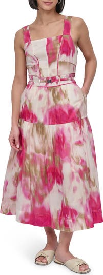 A vibrant watercolor pattern adds a splash of contemporary sophistication to this sleeveless dress complete with a matching belt at the waist.