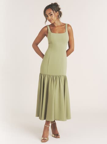The Midi length Drop Hem Dress has be crafted from premium soft tailoring fabric. Made with a semi-matte finish, this flattering style features a clean square neckline making it bra-friendly! The gorgeous drop waist detail creates beautiful movement from the full gathered skirt. A contemporary choice for wedding guests, summer parties, and beyond.