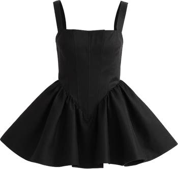 This striking sleeveless dress features a structured bodice with vertical seam detailing and a bold square neckline framed by wide straps. The waistline transitions into a voluminous flared skirt with a pointed seam, creating a dramatic silhouette that blends elegance with fashion-forward flair.