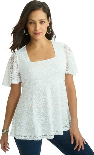 - Some of our favorite styles and fit details come together to make this top one that we&rsquore sure you&rsquoll love. Pair this essential with all your favorite bottoms for elegant outfits fit for every occasion. Peplum silhouette Square neckline Elbow length flutter sleeves Body is lined 30&rdquo length Nylon/spandex Machine washable