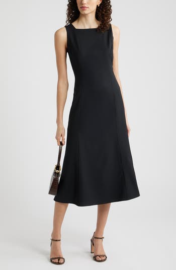 A square neck and princess seams create contemporary shape for this wool-blend midi dress made with a comfortable stretch lining.