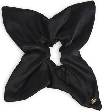 A trusty satin scrunchie is reimagined in a square silhouette and punctuated with petite logo hardware for a hint of gleam.