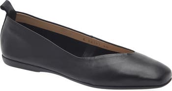 An asymmetrical V-cut refines this square-toe ballet flat crafted from leather and enhanced with a memory gel insole and cushioned arch support.