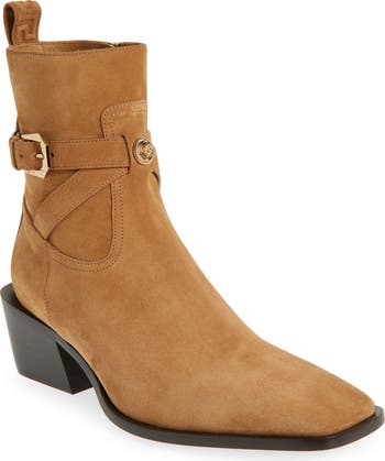 Crafted in Italy from tobacco-colored suede, this square-toe boot makes a striking statement with a belted shaft and a gleaming Medusa medallion. A jutting heel brings a bold, blocky finish to this contemporary style.