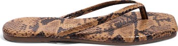 Snake-embossed faux leather and an angular square toe amplify the edgy allure of a Brazilian-made flip-flop set on a cushioned footbed and flexible rubber sole.