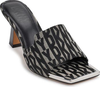 Polished hardware frames the squared-off toe of a sophisticated slide sandal fashioned with a jacquard logo pattern and shiny tapered heel.