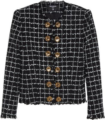Gilded 'Sewing Thread' buttons gleam against fringed tweed on this cropped jacket with bold, softly padded shoulders delivering a look that’s quintessentially Balmain.