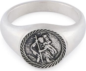 A signet-style ring is crafted from sterling silver and given dimension with a intricate design of St. Christopher, the patron saint of those who travel or are on a journey.