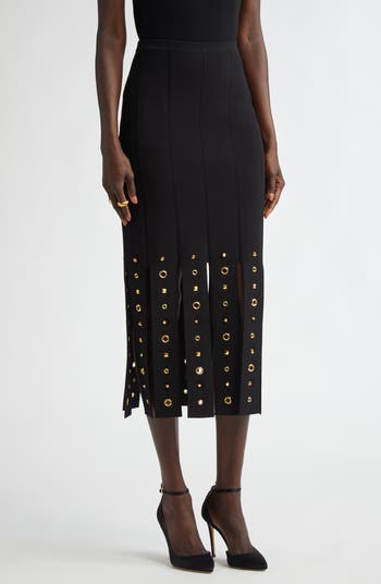 Gleaming studs and grommets and a car wash-inspired hem lend edgy drama to this pencil skirt constructed from engineered knit panels.
