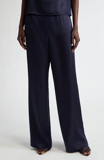 Evening pants are perfectly posh in supple black satin with a high elasticized waist and wide, flowy legs.