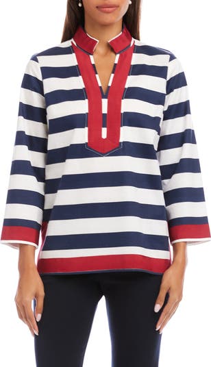 Bright contrast trim plays up the preppy nautical style of this crisply striped tunic complete with three-quarter sleeves.