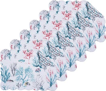 St. Vincent tabletop collection features an allover pattern of coral and tropical fish in hues of teals and pinks. We also offer this pattern on napkins, runners, and either rectangular or round placemats. Reverse to a painterly ripple pattern that lends to an underwater effect for additional styling options. Check out this pattern on our quilts collection as well for a coordinated home décor look!