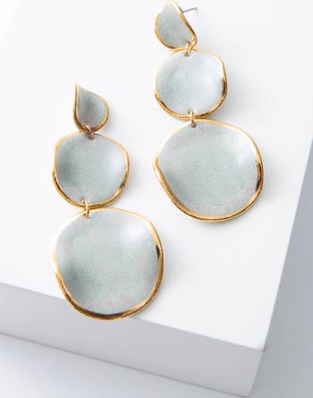 These elegant drop earrings feature handcrafted porcelain discs outlined in shining gold luster. Their wavy silhouette gives them a flowing, organic feel, while their elevated materials give them a sophisticated feel. With their surgical steel posts, these neutral statement earrings are a great pair for sensitive ears.