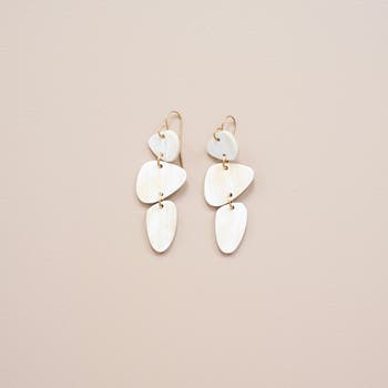 These simple Stacked Stone Earrings are reminiscent of perfectly balanced cairn trail markers. Hand carved and polished from white cow horn, these earrings will provide direction throughout your day. Sustainably sourced horn from rural Ugandan cattle keepers, horn is used and upcycled instead of wasted Hand carved in small scale, Fair Trade artisan cooperative in Uganda High variability of horn color ensures that no two pieces are the same Jewelry pieces come in variable shades of white 14K gold plated findings and stainless steel posts crafted by Fair Trade verified program to provide employment and training to formerly trafficked women Skillfully assembled in Uganda with love and care HANDMADE IN UGANDA APPROXIMATE SIZE: 2. 5" x 1"