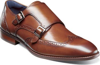Broguing details define the style of a wingtip leather double monk strap shoe that features an arch supporting footbed designed for all day wear.