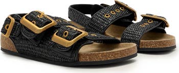 Polished buckle hardware accentuates the slingback silhouette of this casual-staple sandal made from woven raffia.