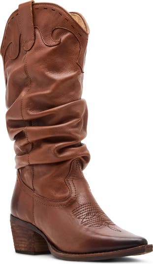 Tonal topstitching and flame-like paneling trimming the shaft amp up the Western inspiration of this slouch boot lifted by a comfortably low block heel.