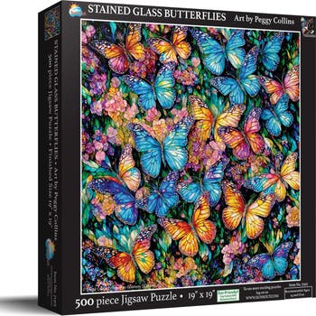 Experience the breathtaking beauty of nature from the comfort of your home with the Stained Glass Butterflies 500 Piece Jigsaw Puzzle for Adults by SunsOut Puzzles, featuring the exquisite licensed artwork of Peggy Collins. Capturing the serene elegance of a sunlit garden where butterflies dance among the flowers with its vibrant colors and intricate details, this 19" x 19" puzzle is crafted meticulously in the USA from eco-friendly recycled cardboard and soy-based inks, highlighting SunsOut's commitment to both sustainable and durable craftsmanship. Whether you're indulging in a tranquil evening or seeking a creative challenge, this puzzle boasts securely interlocking pieces to reduce assembly frustration whilst ensuring a smooth and enjoyable experience. SunsOut Puzzles, a proudly woman-owned small business, not only guarantees customer satisfaction by promptly resolving any issues with missing or damaged pieces but also actively supports eco-friendly practices and outstanding craftsmanship. Reconnecting with the joy of puzzling has never been more rewarding, as each piece you fit into place unravels the colorful allure of butterflies and adds a touch of nature’s beauty into your life. This masterpiece of Peggy Collins makes an impressive display piece and a delightful addition to any puzzle enthusiast's collection.