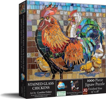 Immerse yourself in a vibrant, challenging world with the "Stained Glass Chickens" 1000 piece jigsaw puzzle for adults – a fascinating marriage of artistic beauty and engaging gameplay by renowned artist Cynthie Fisher. Not just a puzzle, but also a testament to your patience and precision, this stunning 23" x 28" masterpiece comes alive, piece by piece, thanks to the meticulous craftsmanship of SunsOut Puzzles. Each interlocking component, crafted from top-quality recycled cardboard, fits securely to guarantee a seamless, satisfying assembly experience, and to showcase the radiant stained glass artwork upon every connection made. Manufactured using eco-friendly materials, this puzzle embodies SunsOut's dedication to sustainability, underpinning our pride in delivering premium, made-in-the-USA puzzles that minimize environmental footprint. With SunsOut, every purchase ensures peace of mind; our unwavering commitment to quality and customer satisfaction means any issue with missing or damaged pieces gets quickly resolved. Upon completion, the "Stained Glass Chickens" puzzle, adorned with Cynthie Fisher's captivating artwork, becomes a display-worthy testament to your accomplishment, piquing visitors’ curiosity. By choosing SunsOut, a woman-owned small business, you join a vibrant community of puzzle enthusiasts, sharing in the tranquil, rejuvenating joy of puzzle-making. At SunsOut, puzzles aren’t merely a hobby; they’re a gateway connecting appreciators of the enchanting beauty and tranquility of puzzle-making.