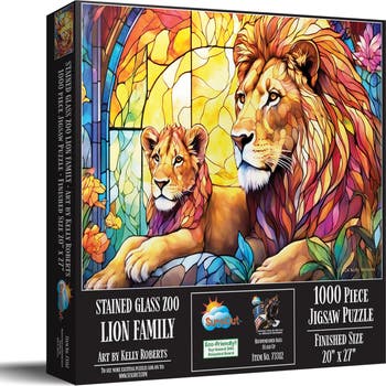 Experience the majestic beauty and splendor of the wild by immersing yourself in the Stained Glass Zoo Lion Family 1000 Piece Jigsaw Puzzle by SunsOut. This masterpiece by artist Kelly Roberts transcends the ordinary puzzle, leading you through a breathtaking journey of vibrant colors and intricate details. Every meticulously crafted piece locks seamlessly into place, creating a stunning 20" x 27" artwork, and a tangible testament to the harmony of fantasy and wildlife. SunsOut takes pride in its eco-conscious approach, utilizing high-quality recycled cardboard and soy-based inks in every puzzle. Every purchase you make supports a woman-owned small business and contributes to our greener planet agenda. We ensure quality craftsmanship and durability in all our products, reflecting our unwavering commitment to sustainability, customer satisfaction, and artistic excellence. Made proudly in the USA, our puzzles grant the tactile satisfaction of working with pieces designed for longevity. Moreover, in case of issues with missing or damaged pieces, our worry-free guarantee offers peace of mind ensuring a delightful puzzling experience. The Stained Glass Zoo Lion Family puzzle is more than just a way to pass time; it's a nexus where art, relaxation, and nature converge. Whether you embark on this puzzle adventure solo or with a group, you're bound to create cherished memories piecing together this enchanting lion family. This puzzle will enlighten any collection, providing you with endless hours of joy and peace, a truly priceless acquisition.
