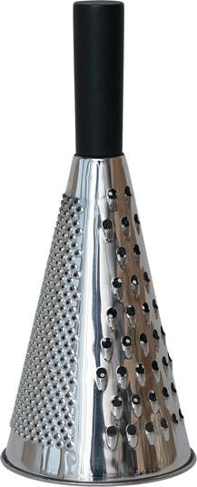 - An elegant cone-shaped grater featuring a sleek stainless steel body and a black mango wood handle