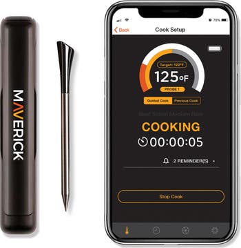 - Monitor your cook from up to 32 feet away with the STAKE™ app (IOS and Android) Battery-free wireless probe powered by a high-heat safe super capacitor Fast 2-minute USB charge provides up to 4 hours of use Set custom alerts or use pre-programmed temperatures for various meats Durable food grade stainless steel probe with 572°F (300°C) heat-resistant ceramic handle App displays temperature, elapsed time, and cook progress graphs Audible alerts notify you when your target temperature is reached Connect and monitor up to 8 probes to cook multiple meats at once