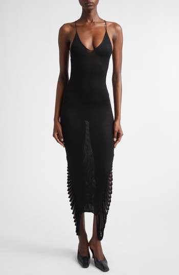 This semisheer, figure-hugging slipdress is knit with slim crossover straps and skipped rows that create sculptural loops at each side. The Trinidadian engineer-turned-designer with an affinity for knitwear uses high-quality Italian yarns, crafting them into exclusive designs for her eponymous line.