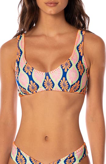 A lace-up detail in the back defines this tropical bikini top with a surprise print on the reverse.