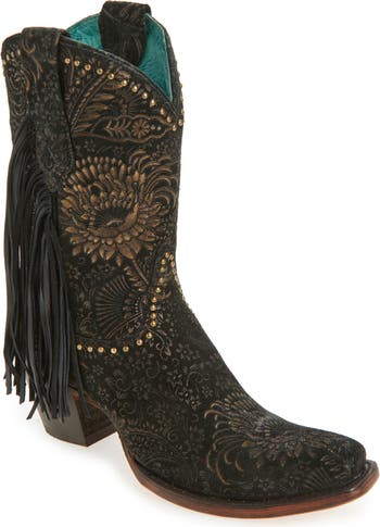This beautifully detailed Western boot is stamped with a golden floral pattern, outlined with domed studs and finished with swishy fringe for a fabulous look. Built with sturdy pull-on straps and a comfortable square toe, this cushioned boot is ready for all-day wear.