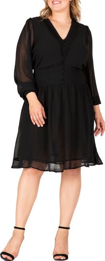 Sheer sleeves frame this swingy chiffon frock updated with an unexpected back cutout.
