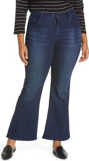 Make a classically cool statement in these high-waist jeans made in a dark wash with flattering flared legs.