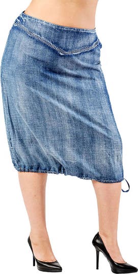A drawstring to slightly cinch the hem adds a fun utility touch to a casual skirt of soft and light Tencel lyocell denim in a faded wash.