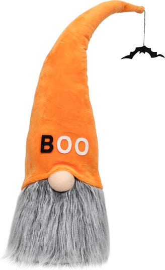 Create a spirited Halloween display with this standing "Boo" Halloween gnome in orange and gray. This delightful tabletop Halloween decoration combines classic gnome design with a seasonal twist, making it an excellent accent for your spooky setup. The gnome wears a tall orange hat that boldly displays the word “Boo” across the front, while a bat cutout decorates the tip for extra Halloween detail. The gray body provides a striking contrast, giving this figure a warm yet spooky seasonal look that fits right in with your autumn décor. Perfectly sized for a tabletop, mantel, shelf, or entryway display, this Halloween gnome is versatile and easy to incorporate into both traditional and whimsical setups. Its sturdy base ensures it stands securely on flat surfaces, making it a hassle-free decoration for any room. Whether used as a single accent piece or grouped with other seasonal gnomes and pumpkin décor, this figure instantly enhances the Halloween atmosphere. Crafted with durability in mind, the standing "Boo" Halloween gnome is designed for repeated seasonal use, becoming a staple in your Halloween decorating. It’s the perfect combination of cute and spooky, making it a must-have for gnome lovers and Halloween enthusiasts alike. Product Features: Standing Halloween gnome Long black and white beard and hair covers the whole body Orange hat is accented with "Boo" and bat cutout dangles from the tip of the hat Hat features bendable wire for easy shaping Weighted flat base for stability Perfect for your mantle, tabletop, or desk Recommended for indoor use only Dimensions: 19.75"H x 6"W x 6"D Material: polyester/faux fur/felt