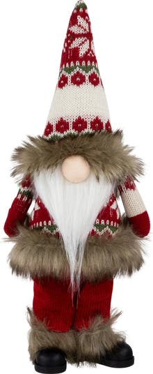 Add a touch of whimsy to your tabletops and mantles with this charming standing gnome. Dressed in an adorable knitted outfit, he features red pants and a pointy hat adorned with red, cream, and green snowflakes. His black boots provide a sturdy base, while his white faux-fur beard and faux-fur accents add a cozy feel. Perfect for display on bookshelves and desks, this gnome is ideal for bringing a playful spirit to your home or office. Product Features: Standing Gnome Christmas figurine Outfitted in a knitted red pants with p mittens Patterned hat and top in red, cream and green Gnome has long beard and a bulbous nose Faux fur accents the hat, body, and feet Stands tall in black boots Recommended for indoor decorative use only Dimensions: 16"H x 6"W x 3.5"D Material(s): polyester/faux fur/plastic