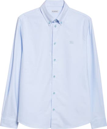 Burberry's iconic Equestrian Knight Design rides throughout this season's styles, pausing to pose for an embroidered portrait at the chest of this slim-fit button-down shirt cut from smooth, crisp cotton oxford.