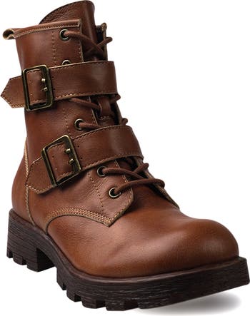 Buckle straps and a lug sole dial up the moto vibes of a lace-up bootie complete with a convenient side zipper.