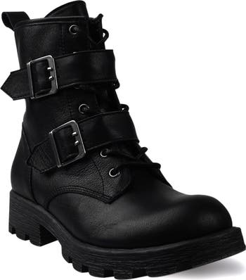 Buckle straps and a lug sole dial up the moto vibes of a lace-up bootie complete with a convenient side zipper.