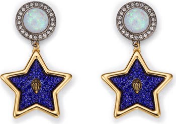 Pavé crystals and faux opal posts lend ultimate shimmer and shine to drop earrings designed to put your star status on display.