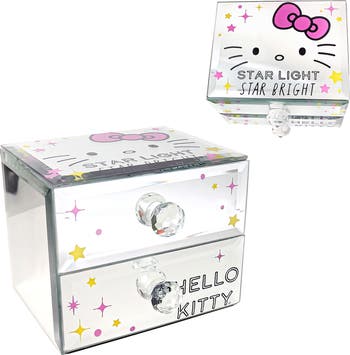 - Officially licensed Sanrio merchandise inspired by Hello Kitty Add a dose of cuteness to your jewelry storage with this compact organizer featuring a mirror finish, two drawers, and a luxurious ultra suede inner lining Hello Kitty jewelry box measures 4"x 4"x 4" and is ideal for rings, earrings, necklaces, bracelets and anklets Gift idea Hello Kitty fans will love on any occasion including Bridal, Valentine's Day, Christmas, Mother's Day, Birthdays, Easter or just because