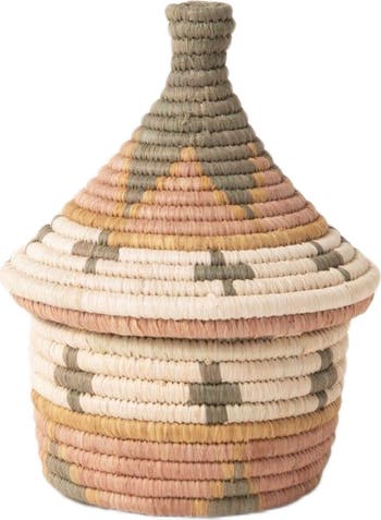In Western Uganda, these sweet, pointy-topped baskets are traditionally used as decorative vessels to hold coffee beans. When visitors arrive to a home, hosts offer them a coffee bean or two to chew on to reenergize them after a long journey. Part of the Elevate Collection, the 2025 annual small batch basket collection. Handcrafted by women artisans from the Batoro living in the very rural mountains of Western Uganda. These weavers are a part of a cooperative that provides training to single mothers, widows and other marginalized women who are subsistence farmers and weave baskets to provide additional income. Made from all natural, sustainably sourced raffia and banana fibers. Unique, bold mix of natural and AZO free dyes - Natural dyes are made from various plant materials grown in artisan’s villages. The women grow, harvest and make all the natural dyes which take a great deal of knowledge and skill to produce. The hand-dyed raffia is twisted and wrapped around coils of banana fibers, creating structure and intricate designs. Weavers hand make each basket from home while tending to other household duties. Baskets can take days to weeks to complete with artists weaving 3 or so hours per day while balancing other responsibilities No two baskets are identical - there will be slight variations in size and color from the one shown due to the handmade nature of each product. Each basket is both special and unique.
