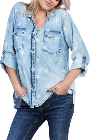 Step out in this star-spangled denim button-up for a casual and classic look. A high-low hem adds extra dimension while the roll-tab cuffs bring a bit of customization.
