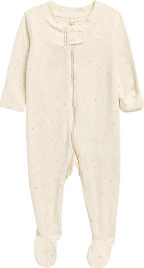 QUINCY MAE Star Print Stretch Organic Cotton Zip Footie, Main, color, Ivory