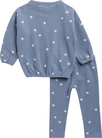 Keep your little stargazer bundled up and comfy in this two-piece set featuring a drop-shoulder crewneck sweatshirt and elastic-waist pants decked in a matching celestial print.