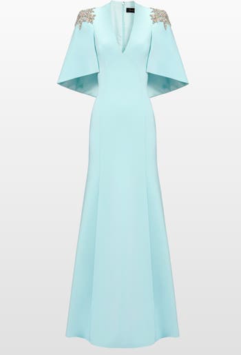 This gown strikes a confident balance between architectural drama and refined elegance. Cut to contour the silhouette, it features a deep V neckline and striking cape-style sleeves that create bold, fluid movement with every step. Embellishment at the shoulders adds a subtle touch of sparkle, drawing the eye to the gowns sculptural lines. The clean, elongated skirt completes the look with understated sophistication perfect for evenings that call for modern glamour with a statement finish.