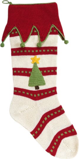 This stocking features a classic red and cream striped design, with vibrant green accents that create a delightful contrast. The centerpiece is a beautifully crocheted Christmas tree, complete with a bright yellow star on top, capturing the spirit of the season. Topped with a playful red cuff complete with green pom-poms for added whimsy and cheer. Perfect for hanging by the fireplace, this stocking is as functional as it is decorative, offering plenty of room for treats, small gifts, and holiday surprises. The durable cotton weave ensures that this stocking will become a cherished part of your holiday traditions for years to come.