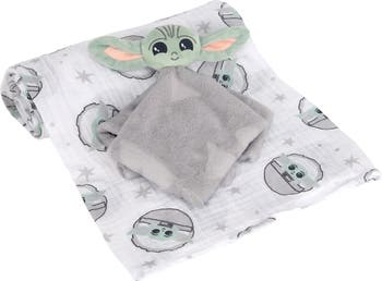 Wrap your little one in total comfort with this white, gray, and green breathable 100% cotton muslin swaddle blanket. It is perfectly sized at 44” X 44”. It features The Child (aka Baby Yoda and Grogu) in his gray pod along with various sized stars on a crisp white ground. This set also includes a lovey (security blanket). Baby Yoda is made in a soft green polyester velour. His head is approximately 7 ½” from ear to ear. Baby Yoda’s face is completely embroidered making him 100% baby safe. The attached blankie is 10” X 10” and features planets, mountains, and stars.