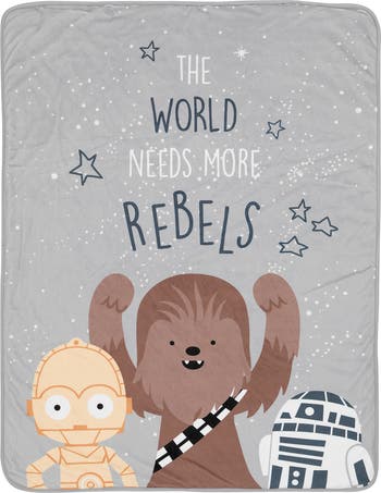 The World Needs More Rebels is printed at the top of this Star Wars baby blanket in dark gray and white. Made in a luxurious minky fabric with a gray faux shearling back for comfort and warmth. Chewbacca is printed on the front center and is 18” tall. He stands in between our favorite droids, R2-D2 and C-3PO. Sized at 30” X 40”, this officially licensed Star Wars blanket is the perfect size for a stroller blanket, using over a car seat or just to keep your little one warm and cozy. A top baby registry pick and makes a perfect baby shower or welcome home baby gift.