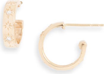 Etched bursts and bezel-set diamonds bring celestial shine to these handcrafted hoop earrings made from 14-karat gold.